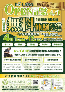 鍼灸整骨院・整体院 Re:LABOオープン記念!期間限定の無料体験イベントを開催いたします。カウンセリング・姿勢チェックを行い、お身体の状態を確認しながら整体をご体験いただけます。肩こり・腰痛をはじめとした日頃感じている […]