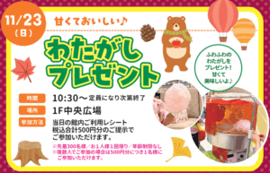 ふわふわわたがしをプレゼント!甘くて美味しいよ♪ (参加方法)当日の館内ご利用レシート税込合計500円分のご提示でご参加いただけます。※先着300名/お1人様1回限り/年齢制限なし※複数人でご参加の場合は500円分につき […]