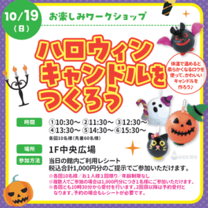 10月19日(日) ハロウィンキャンドルをつくろう 体温で温めると柔らかくなるロウを使ってかわいいキャンドルを作ろう♪ (参加方法)当日の館内ご利用レシート税込合計1,000円分のご提示でご参加いただけます。※各回10名様/お1人様1回限り/年齢制限なし※複数人でご参加の […]