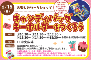 2月15日(日) キャンディバッグキーホルダーをつくろう キャンディの袋に好きなビーズをつめてかわいいキーホルダーをつくろう! (参加方法)当日の館内ご利用レシート税込合計1,000円分のご提示でご参加いただけます。※各回10名様/お1人様1回限り/年齢制限なし※複数人でご参加 […]