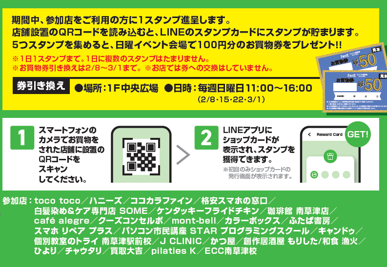 期間中、参加店をご利用の方に1スタンプ進呈します。
