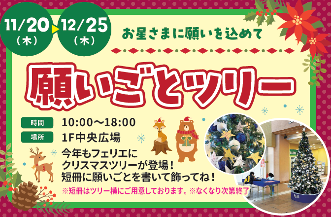 イベント 願いごとツリー 11月20日(木)~25日(木) 今年もフェリエにクリスマスツリーが登場!短冊に願いごとを書いて飾ってね♪ (参加方法)※短冊はクリスマスツリー横にご用意しております。※無くなり次第終了。 開催日 11月20日(木)~25日(木) 時間 10:00~18:00 場所 1F中央広場 チラシ(PDF)を詳しく見る イベント&ニュース一覧に戻る