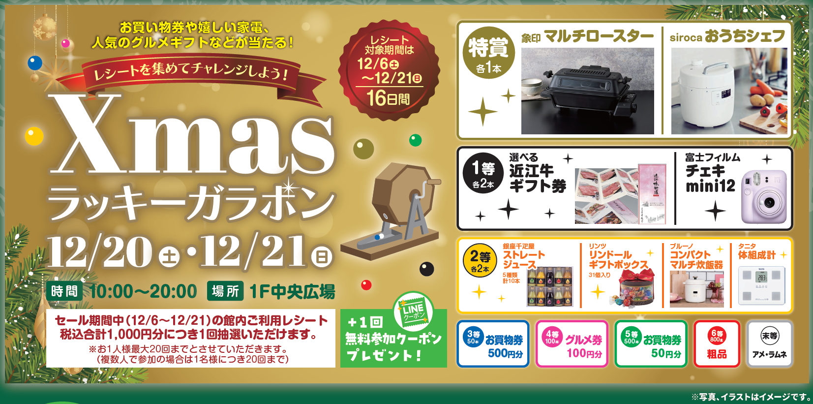セール期間中(12/6~12/21)の館内ご利用レシート税込合計1,000円分につき1回抽選いただけます。