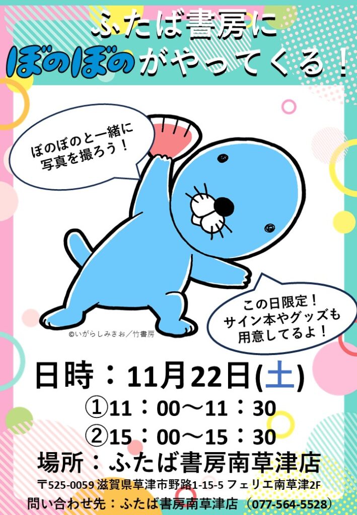 ふたば書房南草津店にぼのぼのが遊びにやってくる!