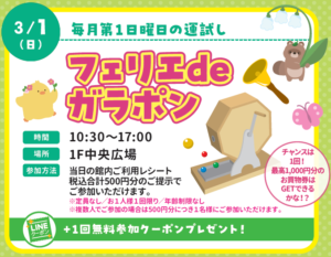 毎月第1日曜日の運試し♪最高1,000円分のお買物券はGETできるかな? (参加方法)当日の館内ご利用レシート税込合計500円分のご提示でご参加いただけます。※定員なし/お1人様1回限り/年齢制限なし※複数人でご参加の場 […]